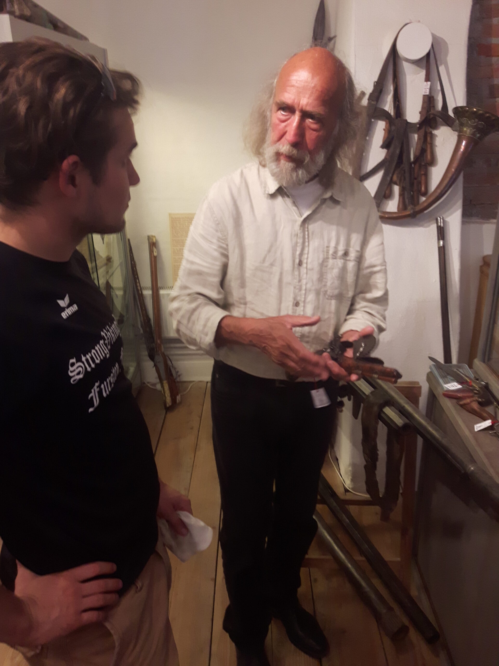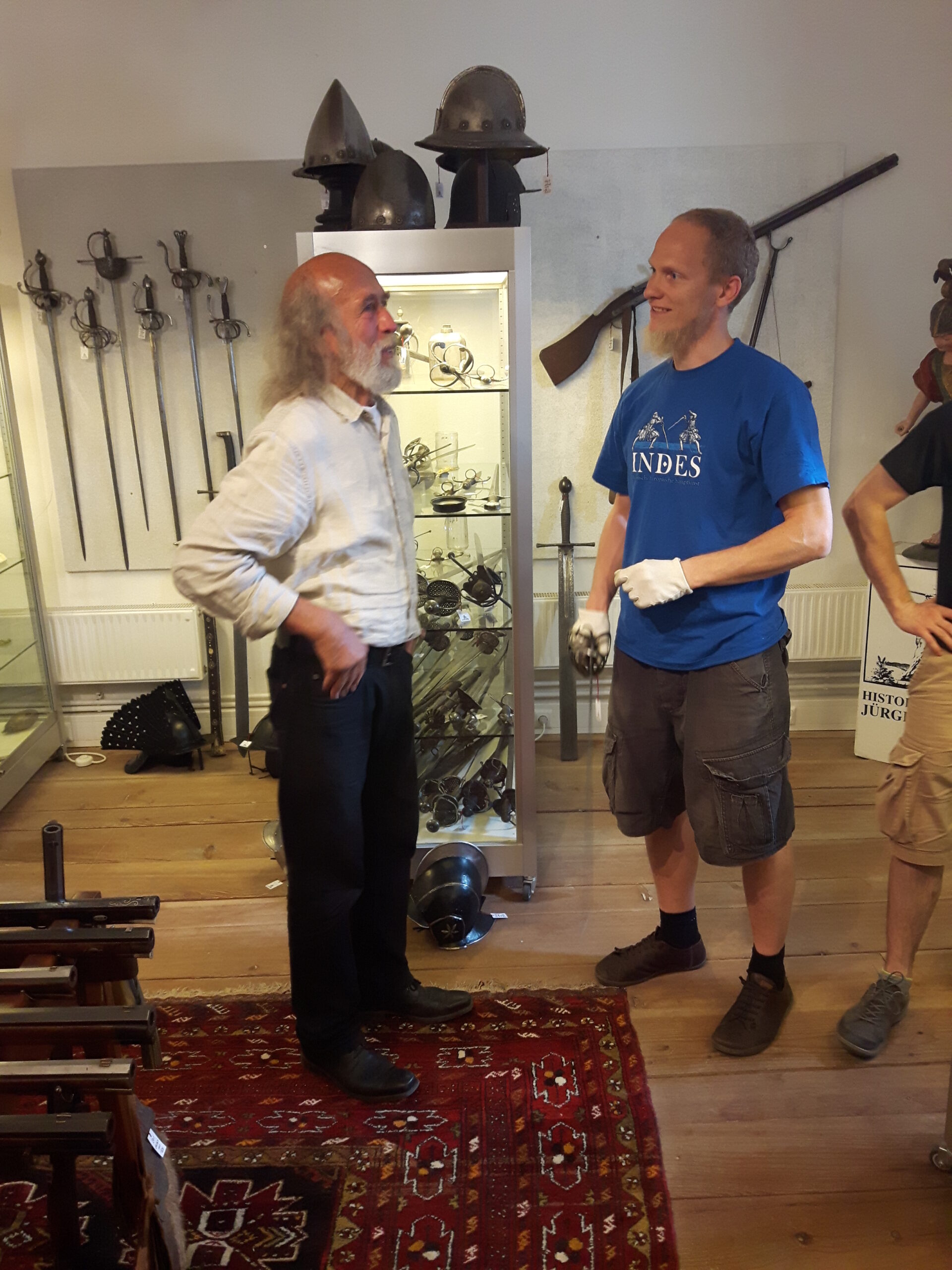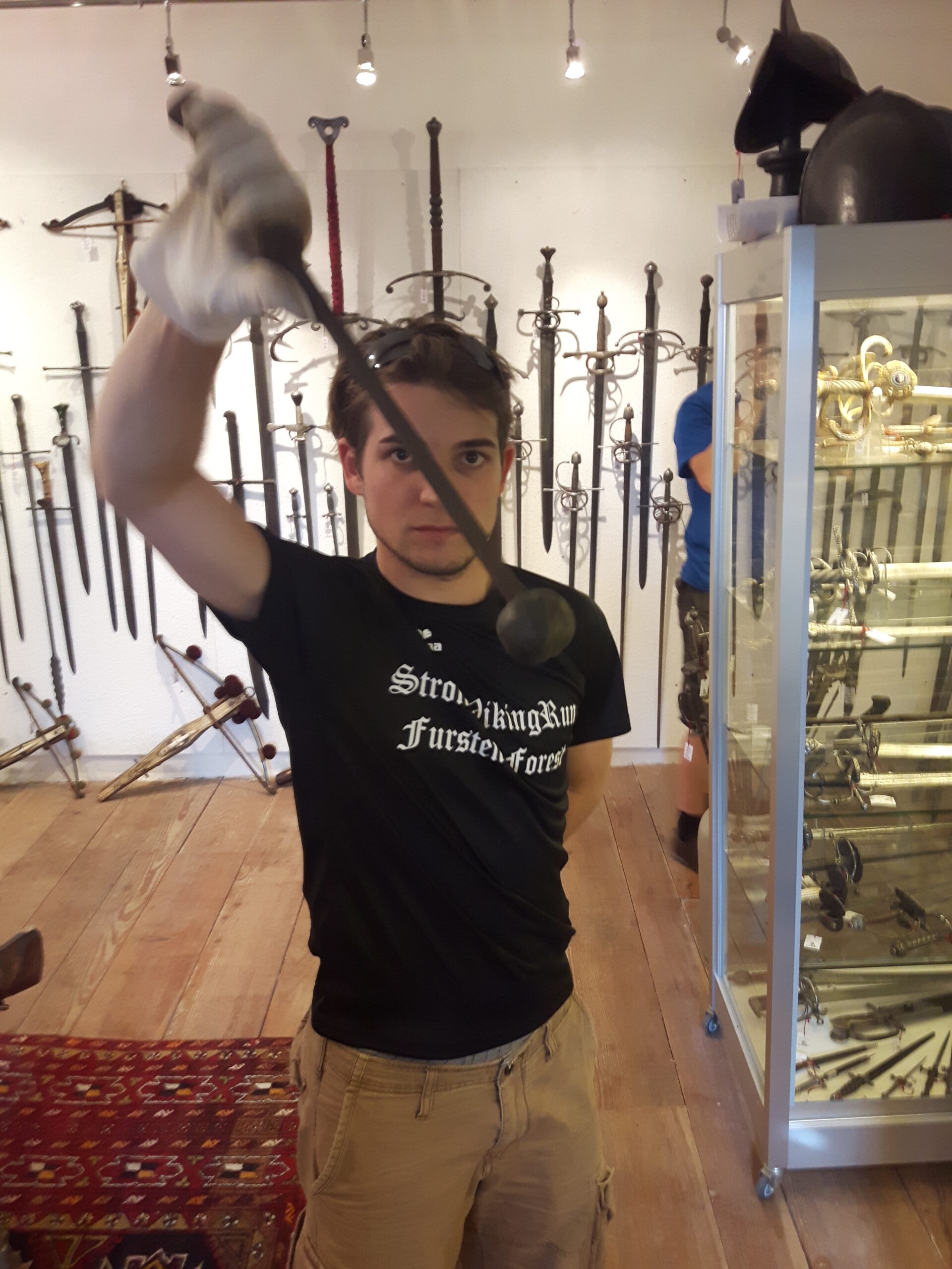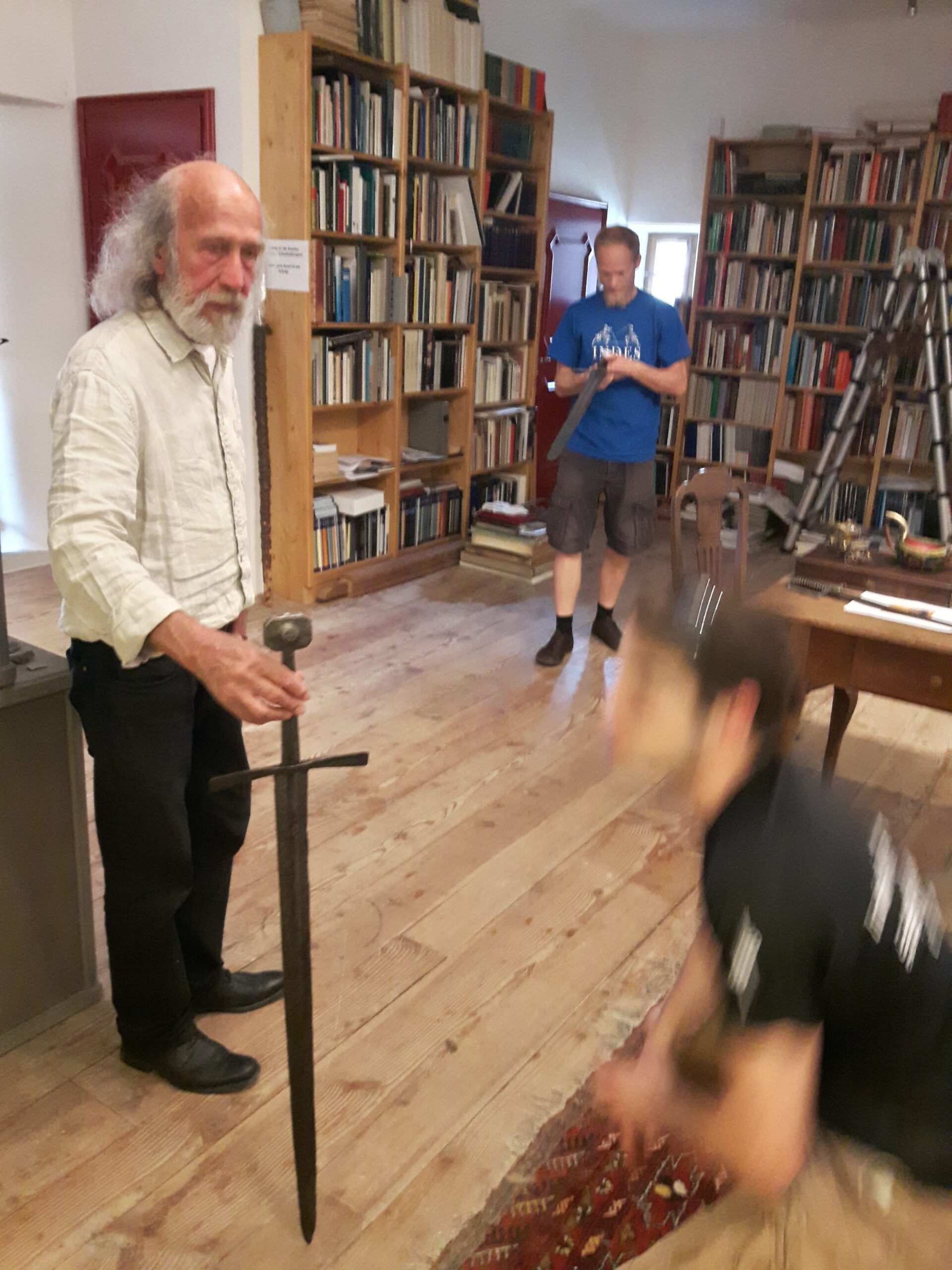 Jürgen H. Fricker hat seit seinem ersten Fund – einem halbverrosteten Säbel in einem Bach in früher Jugend – aus seiner Passion eine Profession gemacht: Er ist Sachverständiger für historische Waffen, Sammler und Händler. Getreu seinem Motto „Kunst ist die schönste Wertanlage“ hat er in den vergangenen Jahren schon manch einem Schwertliebhaber zu einem originalen Sammlerstück verholfen und auch schon Museen von Deutschland bis ins ferne Japan bestückt. Jürgen öffnete seine Schatzkammer über zwei Stunden für die Swordtrip-Crew, die aus dem Sabbern nicht mehr herauskam. Anders als in anderen Sammlungen oder gar Museen hatte er auch keinerlei Berührungsängste, was das „Ausprobieren“ von über 500 Jahre alten Originalen anbelangte… Worin das mündete, kann man sich vorstellen: Die drei Swordtripper und Schwertschmied Lukas Mästle-Goer (selbst HEMA-Trainer bei den Schwabenfedern), der als Verstärkung mit angereist war, probierten sich ausgiebig durch die Vitrinen. „Darf ich noch mal KURZ das xxxx da drüben??“, und „Eine letzte Frage habe ich noch…??“ waren die beiden Sätze, die Jürgen gefühlte 100 Mal über sich ergehen ließ – und mit stoischer und freundlicher Contenance erwiderte.