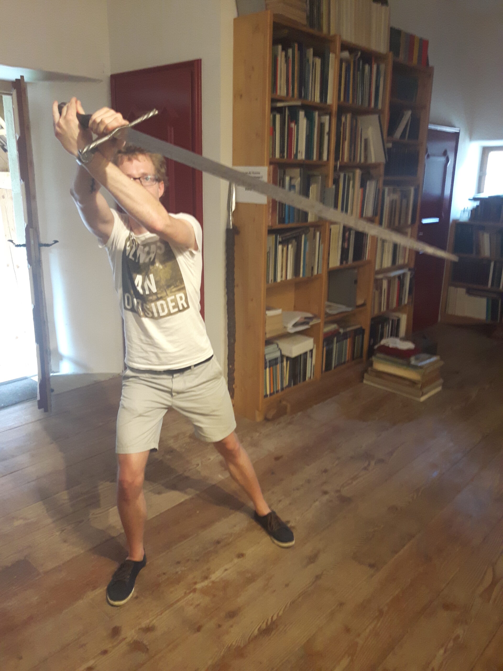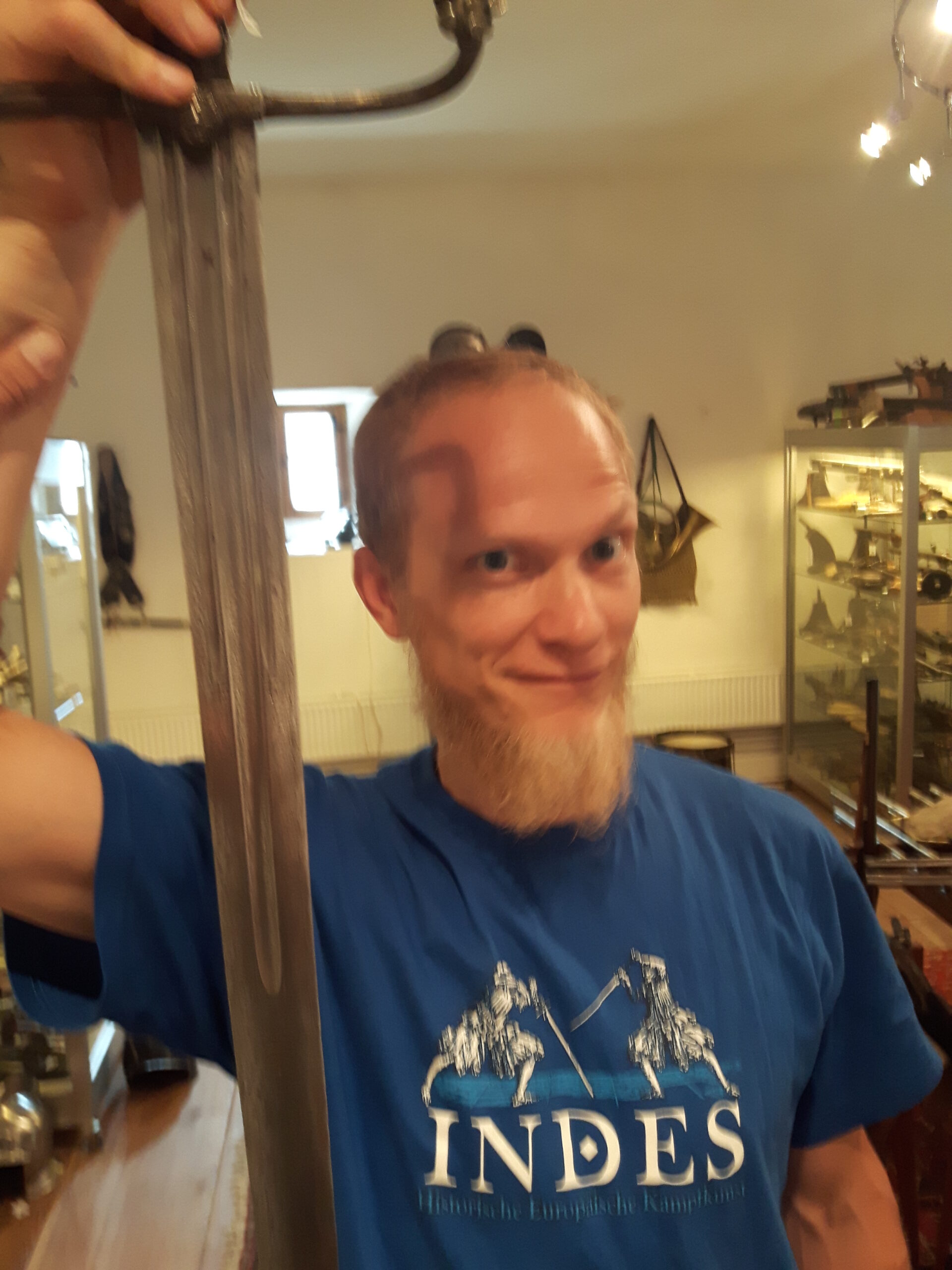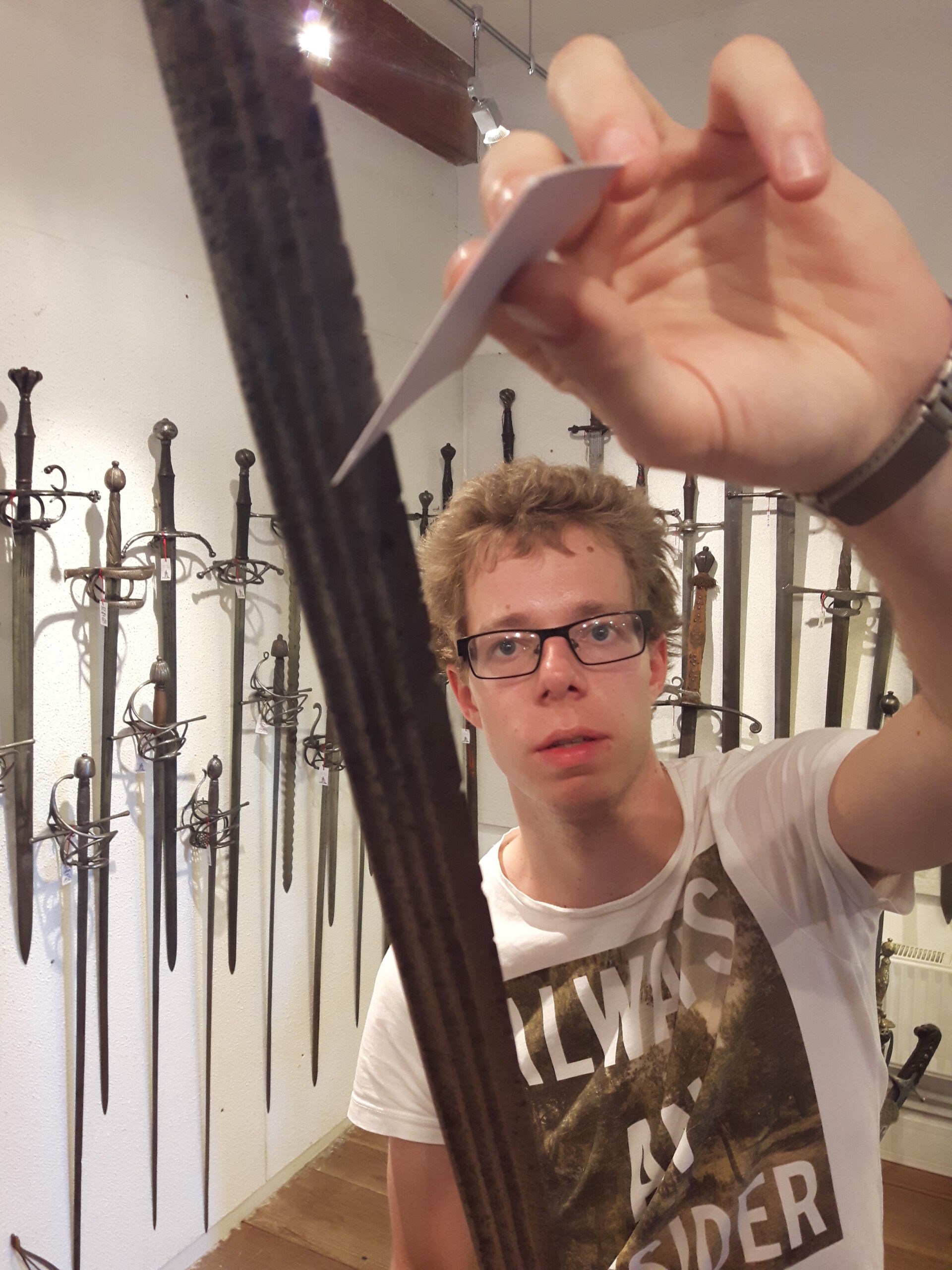 Jürgen H. Fricker hat seit seinem ersten Fund – einem halbverrosteten Säbel in einem Bach in früher Jugend – aus seiner Passion eine Profession gemacht: Er ist Sachverständiger für historische Waffen, Sammler und Händler. Getreu seinem Motto „Kunst ist die schönste Wertanlage“ hat er in den vergangenen Jahren schon manch einem Schwertliebhaber zu einem originalen Sammlerstück verholfen und auch schon Museen von Deutschland bis ins ferne Japan bestückt. Jürgen öffnete seine Schatzkammer über zwei Stunden für die Swordtrip-Crew, die aus dem Sabbern nicht mehr herauskam. Anders als in anderen Sammlungen oder gar Museen hatte er auch keinerlei Berührungsängste, was das „Ausprobieren“ von über 500 Jahre alten Originalen anbelangte… Worin das mündete, kann man sich vorstellen: Die drei Swordtripper und Schwertschmied Lukas Mästle-Goer (selbst HEMA-Trainer bei den Schwabenfedern), der als Verstärkung mit angereist war, probierten sich ausgiebig durch die Vitrinen. „Darf ich noch mal KURZ das xxxx da drüben??“, und „Eine letzte Frage habe ich noch…??“ waren die beiden Sätze, die Jürgen gefühlte 100 Mal über sich ergehen ließ – und mit stoischer und freundlicher Contenance erwiderte.