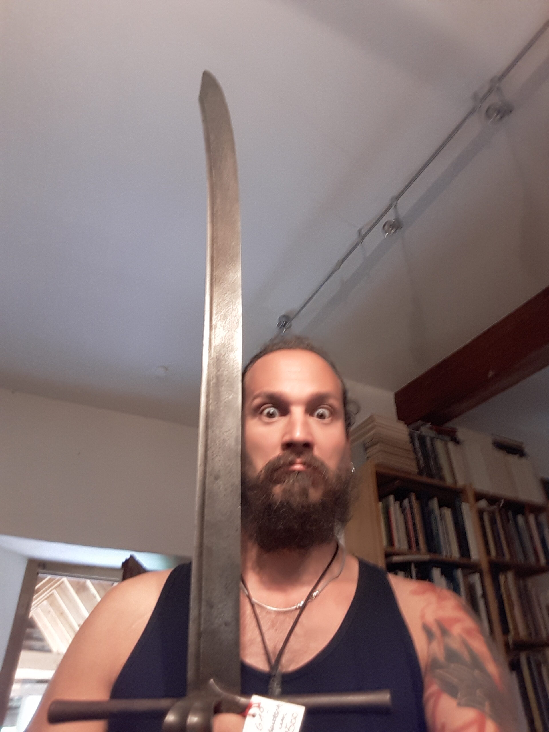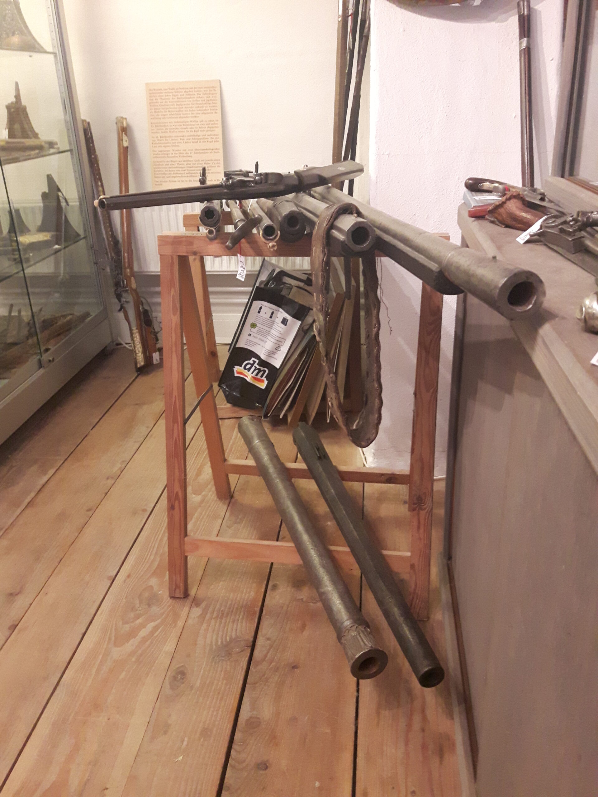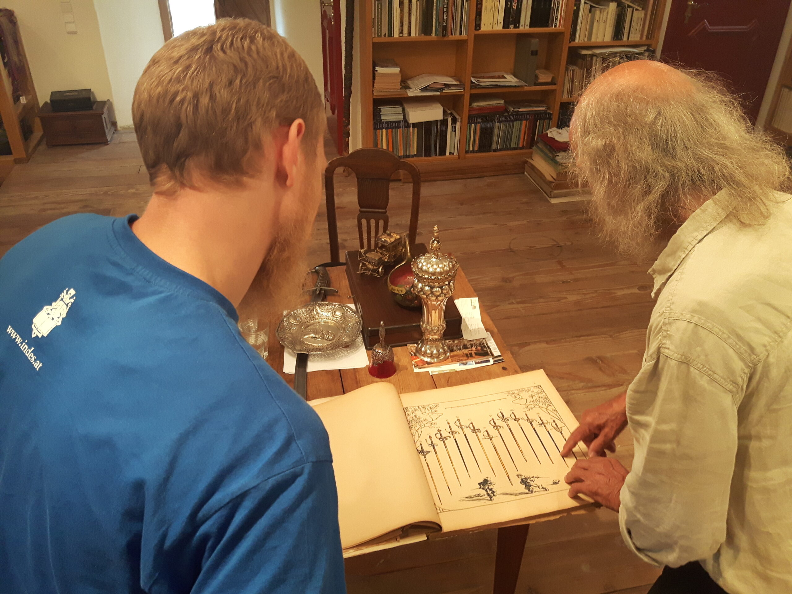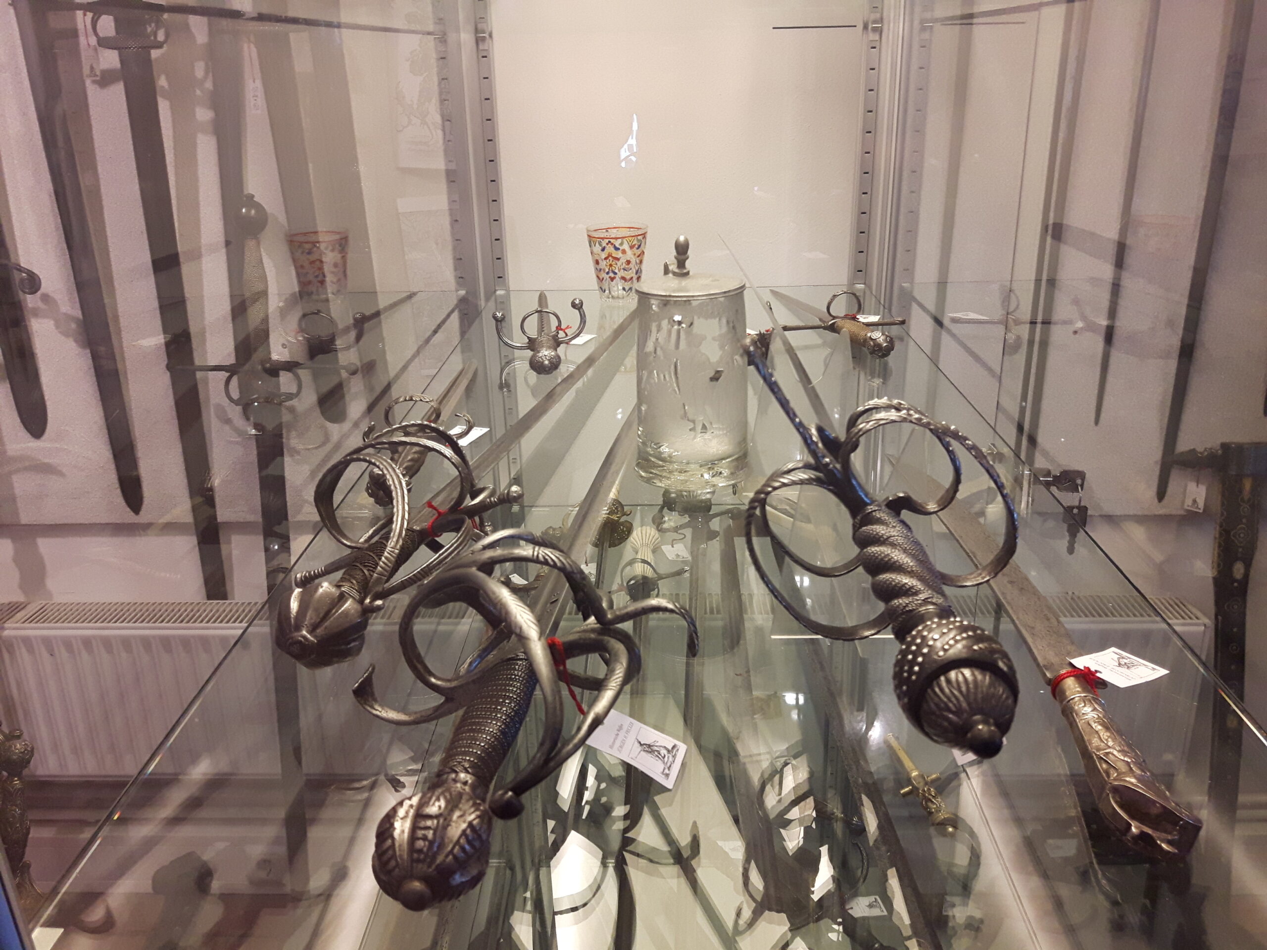 Jürgen H. Fricker hat seit seinem ersten Fund – einem halbverrosteten Säbel in einem Bach in früher Jugend – aus seiner Passion eine Profession gemacht: Er ist Sachverständiger für historische Waffen, Sammler und Händler. Getreu seinem Motto „Kunst ist die schönste Wertanlage“ hat er in den vergangenen Jahren schon manch einem Schwertliebhaber zu einem originalen Sammlerstück verholfen und auch schon Museen von Deutschland bis ins ferne Japan bestückt. Jürgen öffnete seine Schatzkammer über zwei Stunden für die Swordtrip-Crew, die aus dem Sabbern nicht mehr herauskam. Anders als in anderen Sammlungen oder gar Museen hatte er auch keinerlei Berührungsängste, was das „Ausprobieren“ von über 500 Jahre alten Originalen anbelangte… Worin das mündete, kann man sich vorstellen: Die drei Swordtripper und Schwertschmied Lukas Mästle-Goer (selbst HEMA-Trainer bei den Schwabenfedern), der als Verstärkung mit angereist war, probierten sich ausgiebig durch die Vitrinen. „Darf ich noch mal KURZ das xxxx da drüben??“, und „Eine letzte Frage habe ich noch…??“ waren die beiden Sätze, die Jürgen gefühlte 100 Mal über sich ergehen ließ – und mit stoischer und freundlicher Contenance erwiderte.