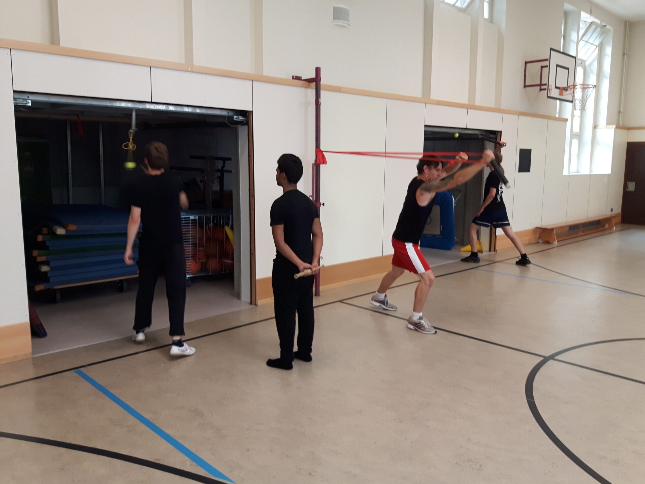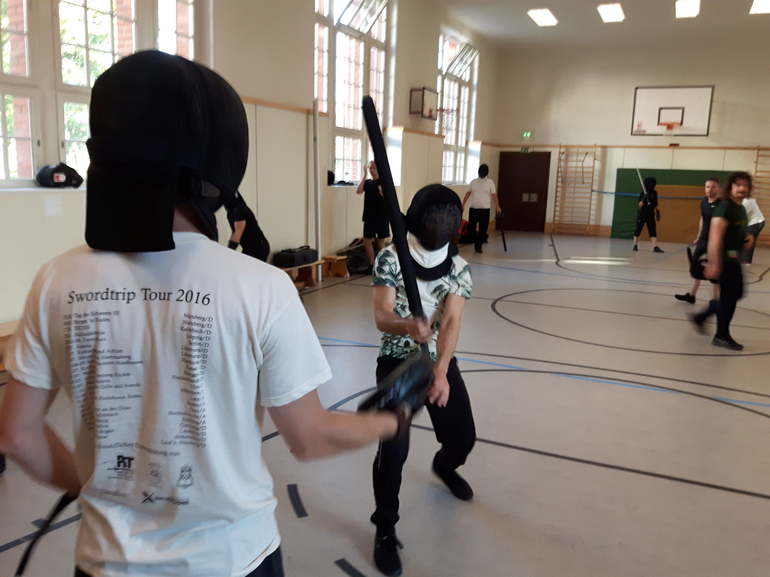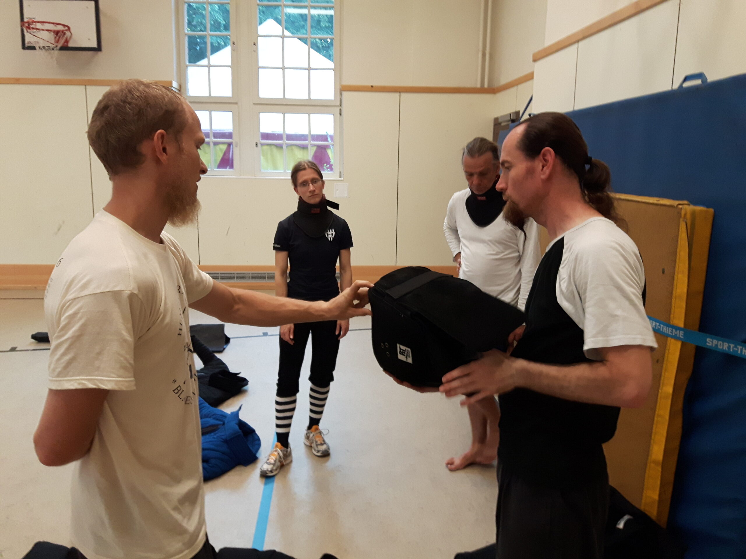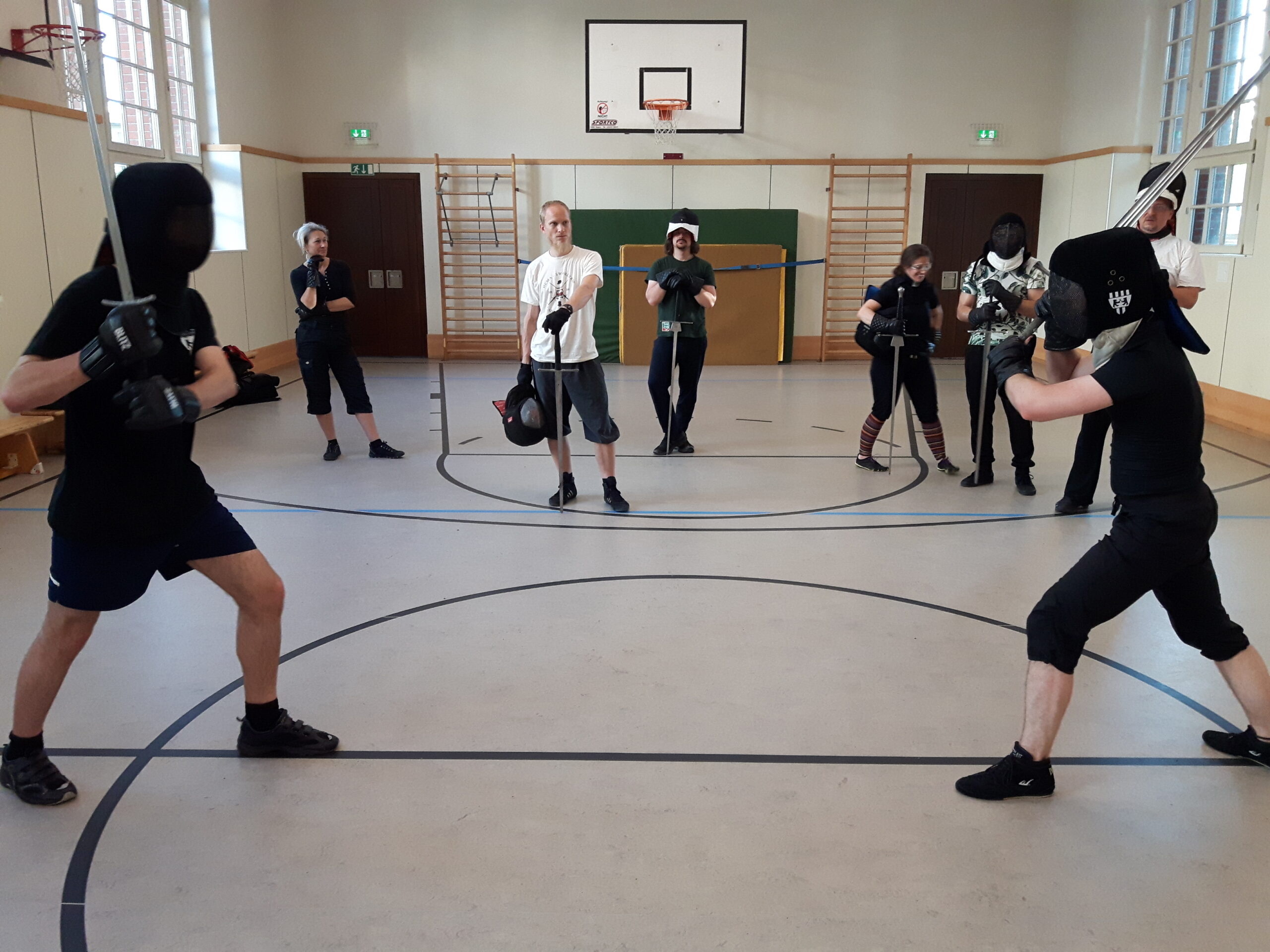 Die Bundeshauptstadt Berlin und der dort beheimatete DDHF-Verein Twerchhau hat uns gleich zwei Tage lang in Atem gehalten: Am Mittwoch gab es eine sehr körperlich ausgerichtete Trainingseinheit Langes Schwert mit dem Thema – Überraschung – Twerchhau. Zusammen mit Trainer Benjamin schwitzten wir in einer wunderschönen Turnhalle in der Bouchestraße in Berlin um die Wette. Vor allem die Aufwärmsessions mit ordentlich Pratzeneinheiten hatten es in sich. Danach gabs Anwendungen vom Twerchhau offensiv wie defensiv – und eine krönende Runde Freigefechte.