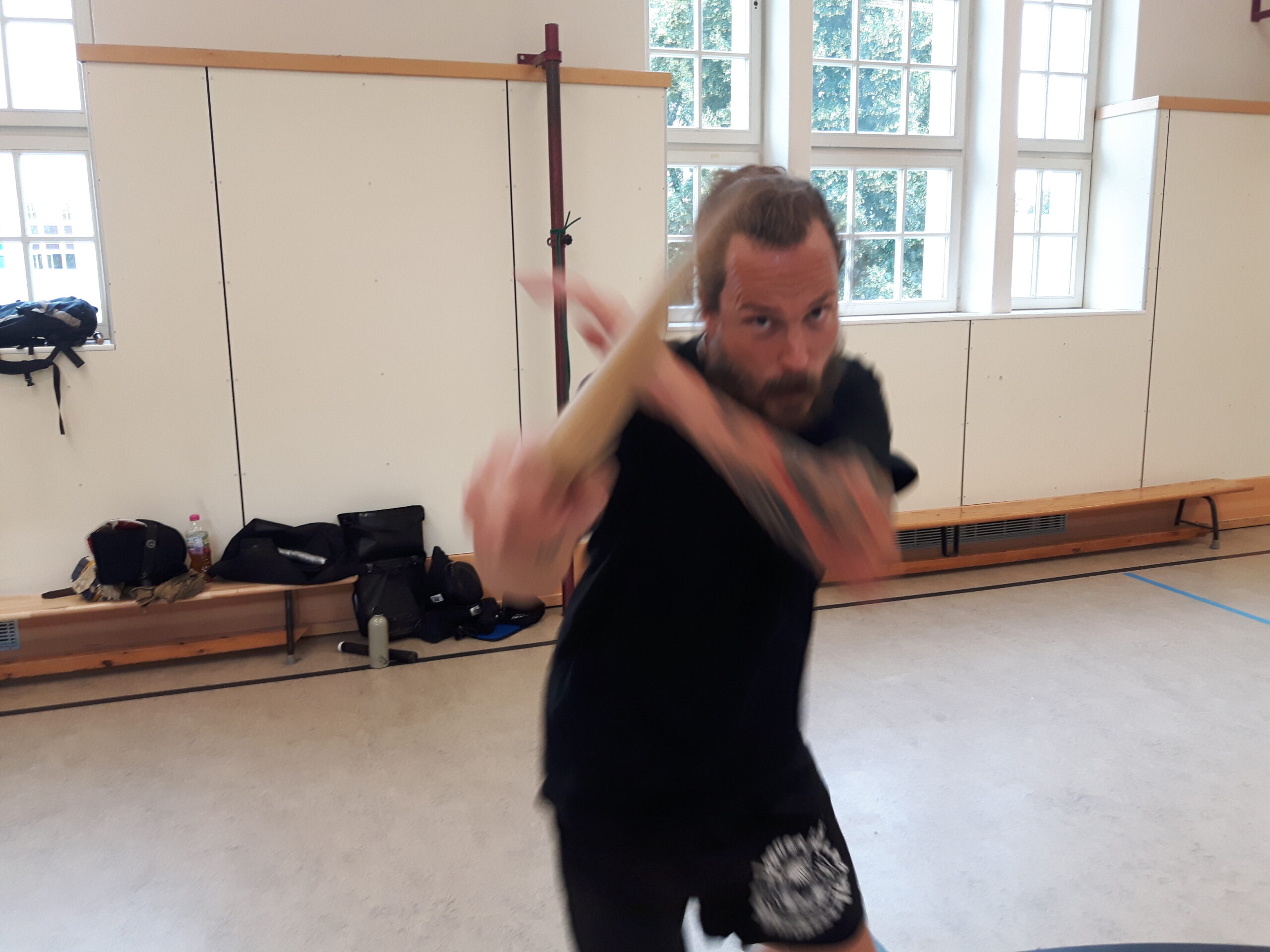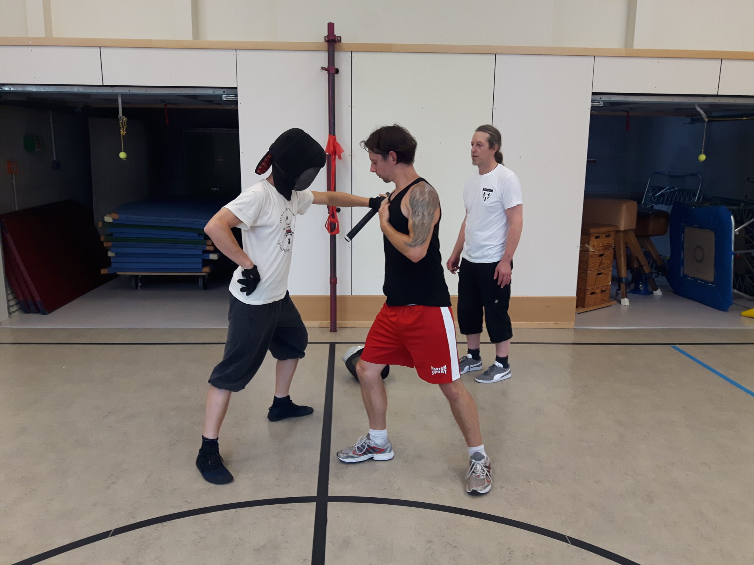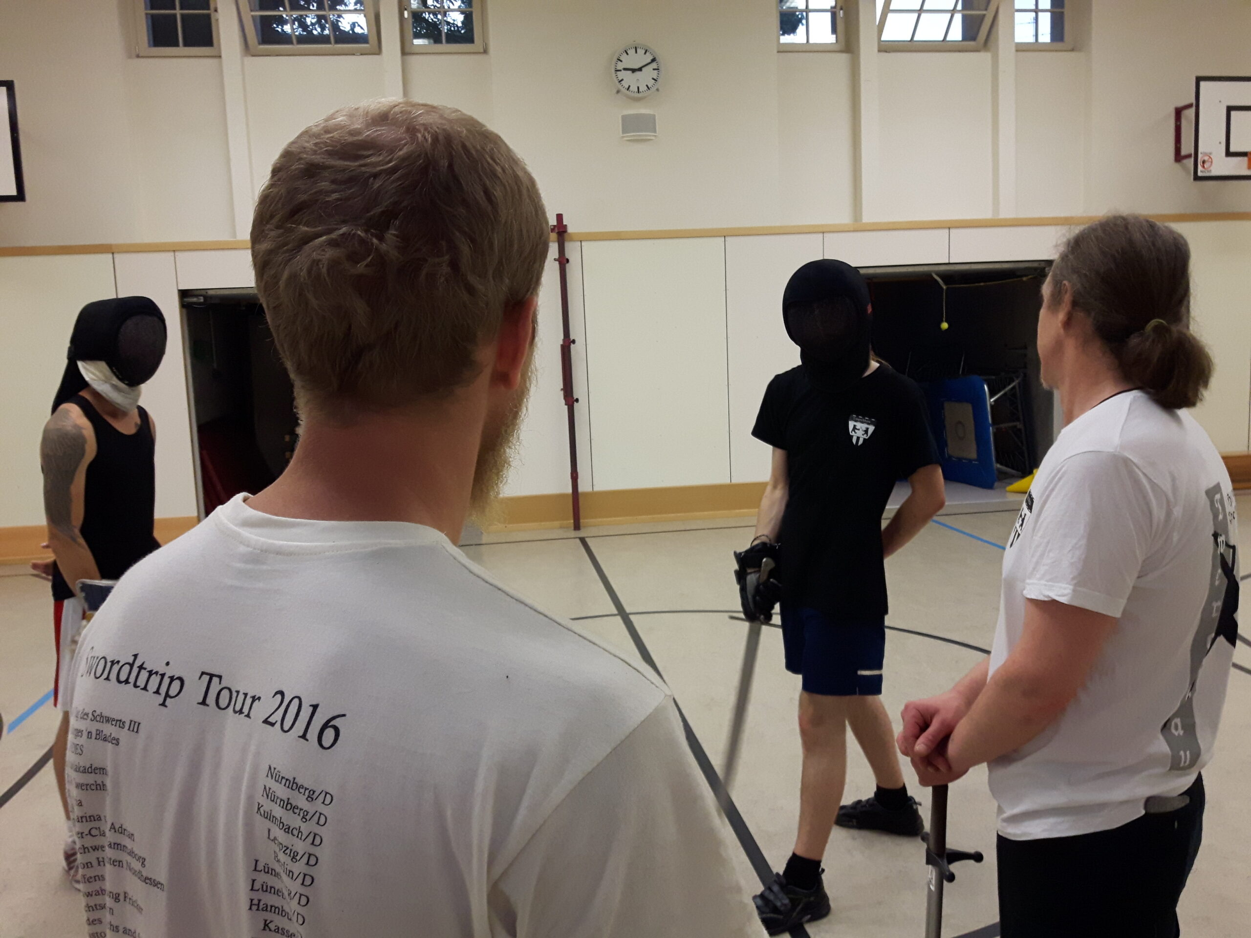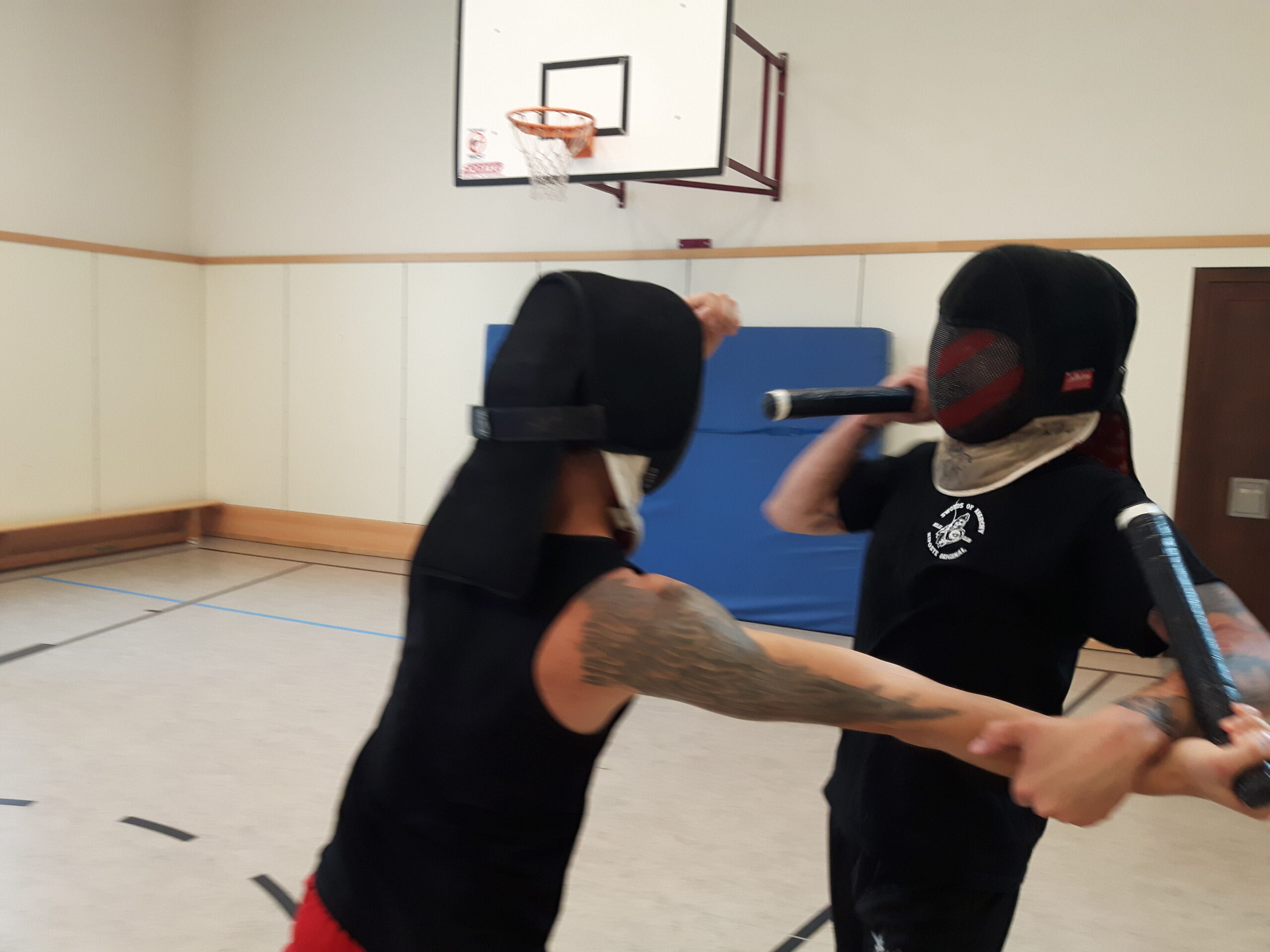 Wer dann noch den Arm heben konnte, bekam als Nachspeise noch eine Einheit Langes Messer serviert – hier relativ grundlegende Techniken: Unterhau gegen Oberhau, Oberhau gegen Oberhau und ein bissel Wecker. Beeindruckend, was Twerchhau auch hier im Sparringsbereich auf die Beine gestellt hat.