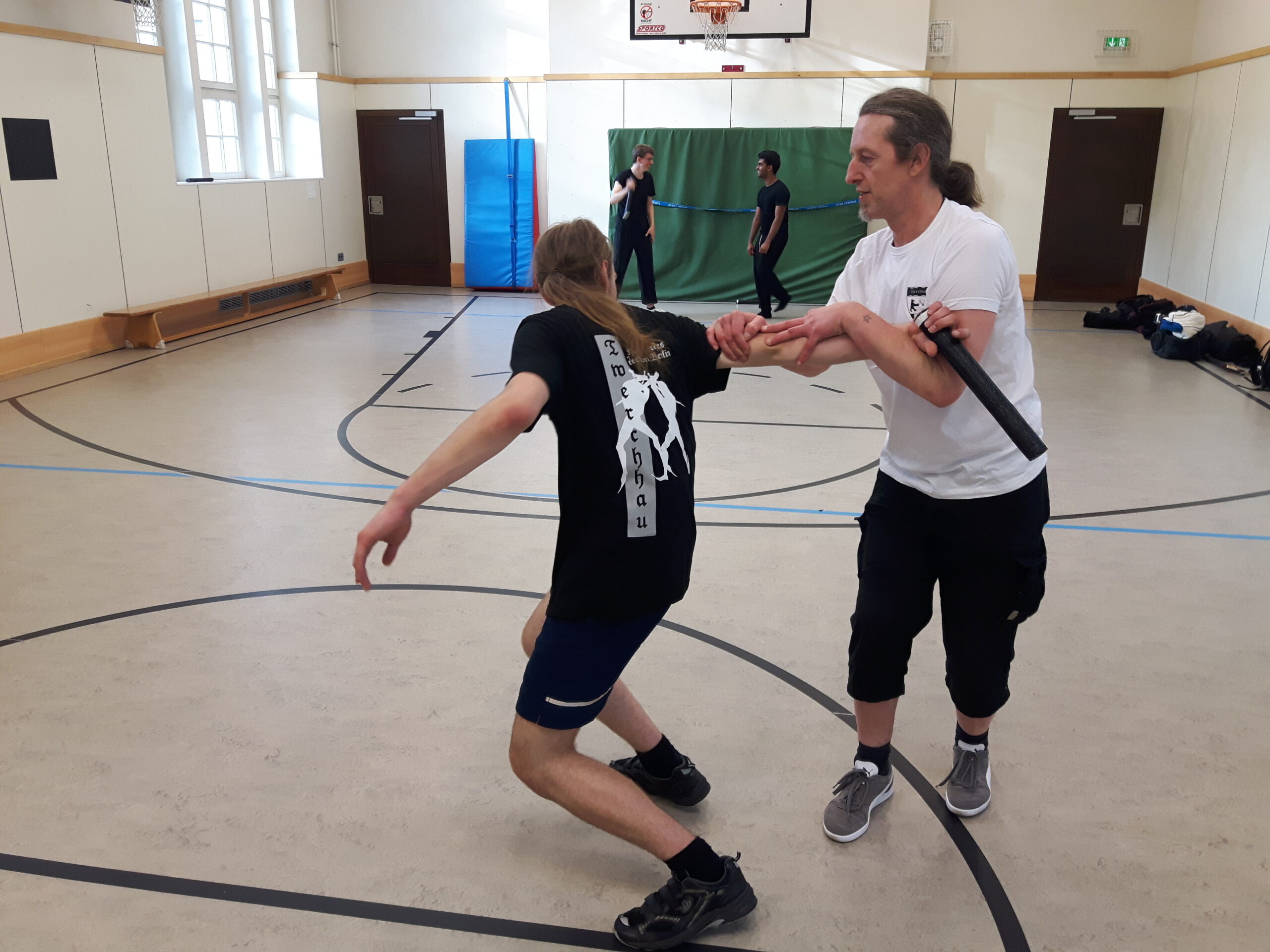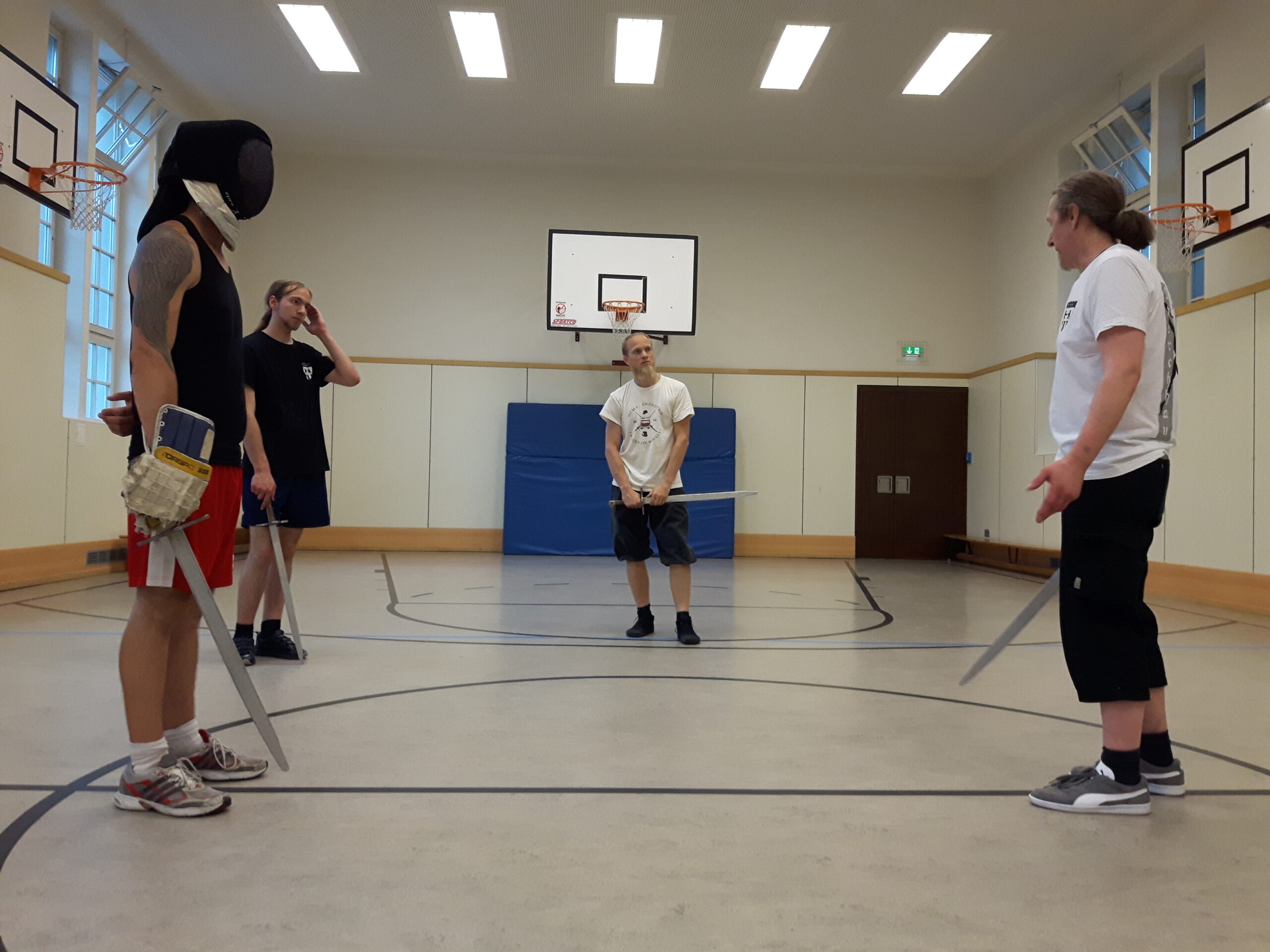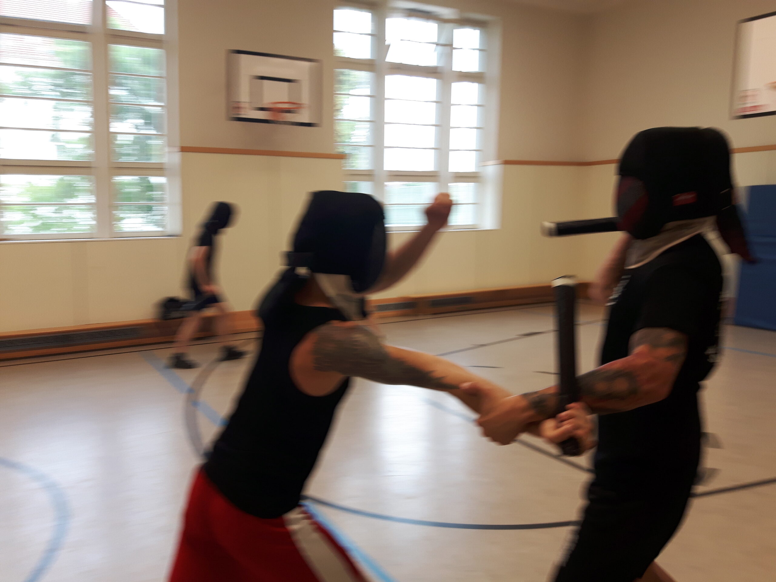 Wer dann noch den Arm heben konnte, bekam als Nachspeise noch eine Einheit Langes Messer serviert – hier relativ grundlegende Techniken: Unterhau gegen Oberhau, Oberhau gegen Oberhau und ein bissel Wecker. Beeindruckend, was Twerchhau auch hier im Sparringsbereich auf die Beine gestellt hat.