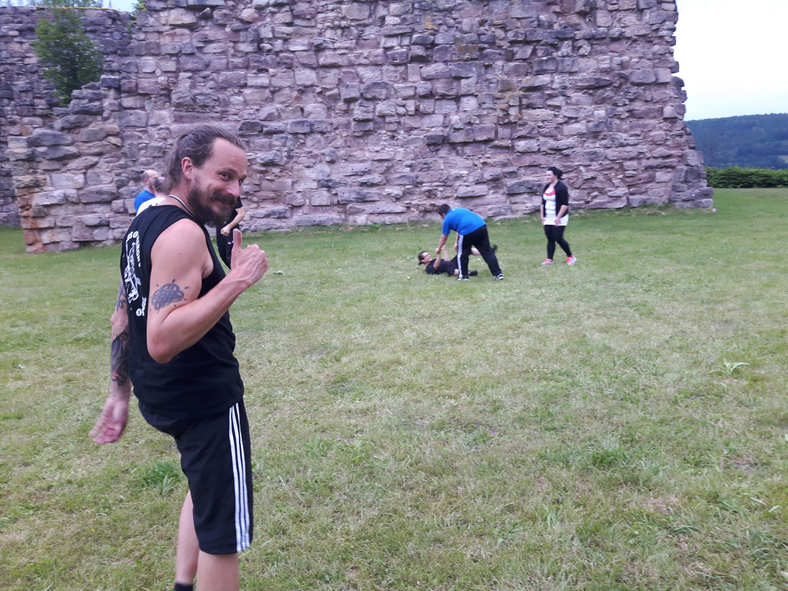 Nach einem reichlich verspäteten Aufbruch und einem Spontanbesuch bei Mr. Trainingsschwerter war unsere erste Station am Montag die Plassenburg, die malerisch über Kulmbach thront. Hier wurden wir von Benny Dippold, Obmann des ersten deutschen INDES-Ablegers Kulmbach und seinen Mitstreitern sehr herzlich in Empfang genommen. Trainiert wurde auf einer Freifläche hinter der Burg – eine kleine Einheit waffenlose Techniken und als Hauptgericht einen Satz Parade-Riposte. Augeklingen konnte der Abend bei fränkischem Bier in Bennys Heim. Vielen Dank für die Gastfreundschaft!